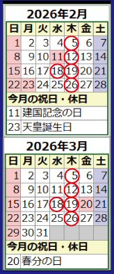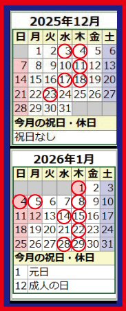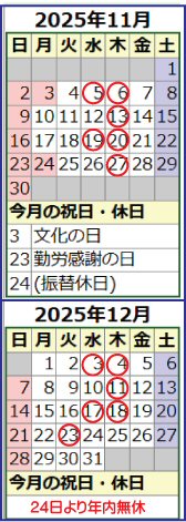 〇で囲まれた日が休業日となりますので確認してご来店ください。