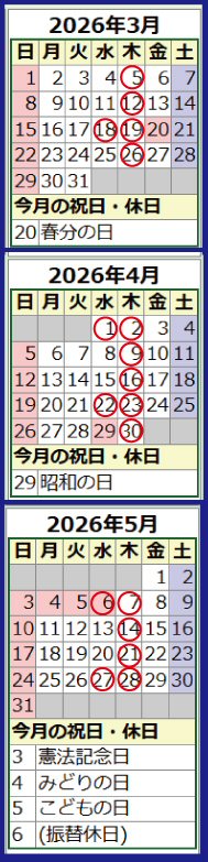 〇で囲まれた日が休業日となりますので確認してご来店ください。